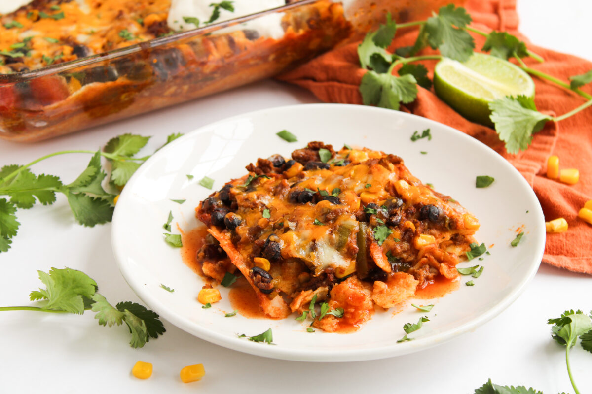 You can prep the beef mixture and layer the casserole the day before you plan to eat it. Keep it covered in the fridge, then bake when you’re ready. Bonus: the flavors get even better because the tortillas soak up a bit more sauce!