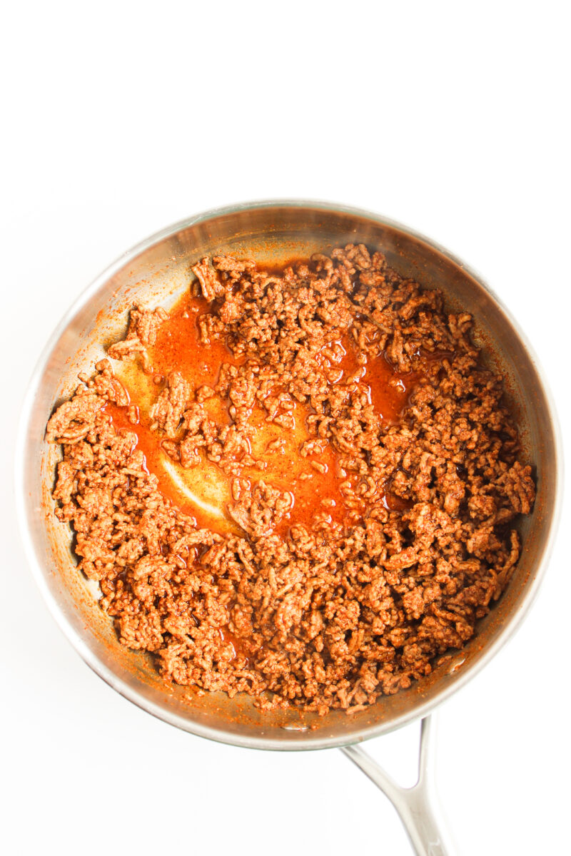 Start by cooking the ground beef in a large skillet, then stir in the taco seasoning and a splash of water. The smell alone is enough to get your mouth watering!