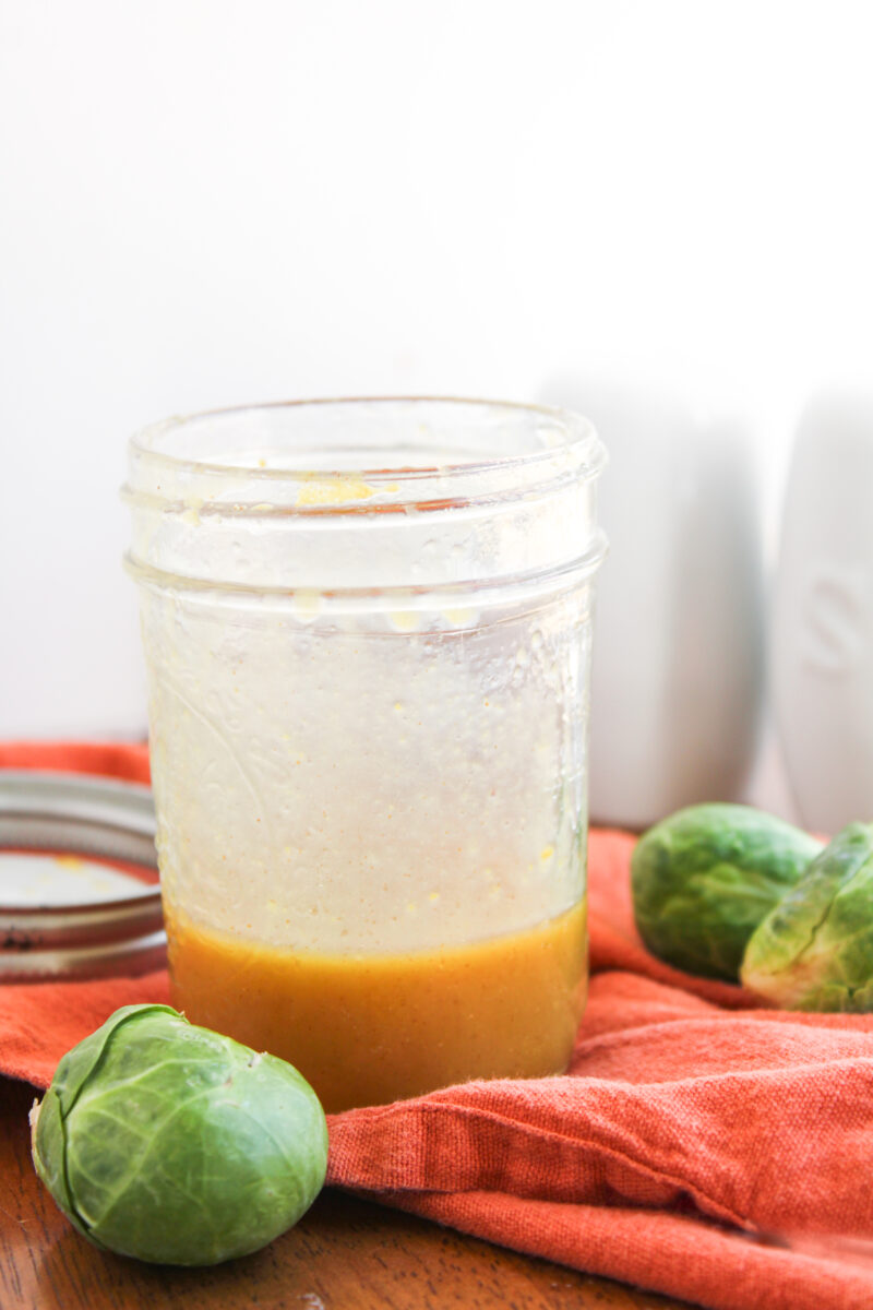 This sauce is so easy to make. We love drizzling it over vegetables or using it as a salad dressing. So while the Brussels sprouts are cooking, make the sauce by combining the honey, oil, mustard, and salt/pepper. Just add all the ingredients to a small mason jar (this size works great), cover it with the lid, and shake until everything is mixed together.
